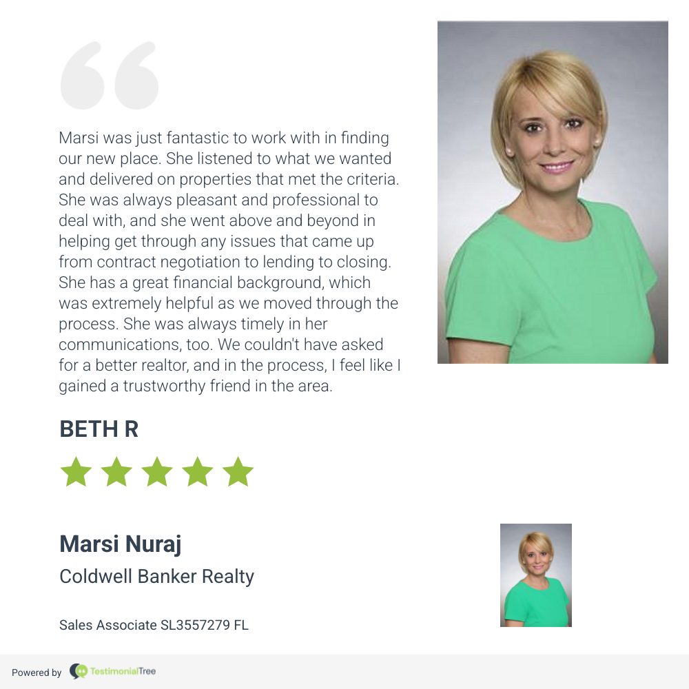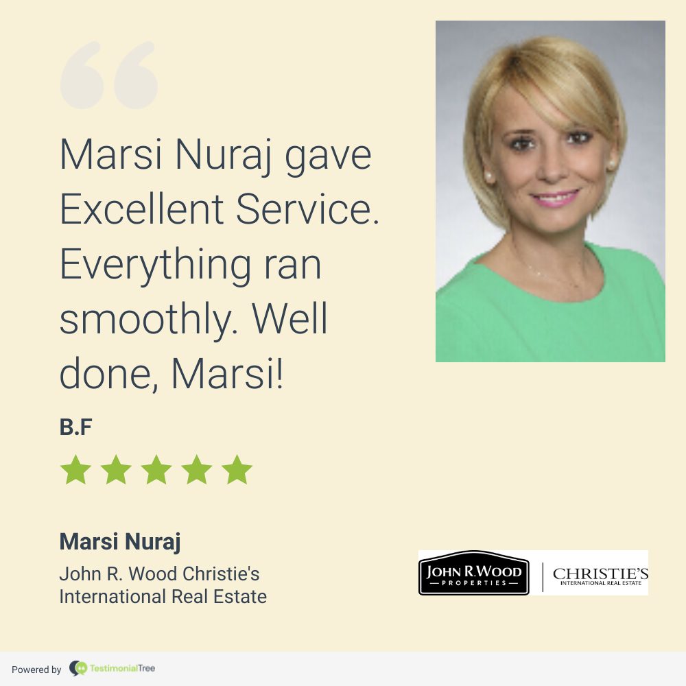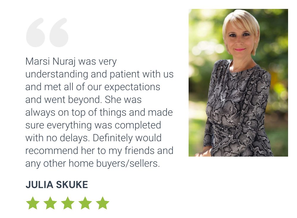 Marsi Nuraj was very understanding and patient with us. She met all of our expectations and went beyond. She was always on top of things and made sure everything was completed with no delays. Definitely I would recommend Marsi to my friends and any other home buyers/sellers.