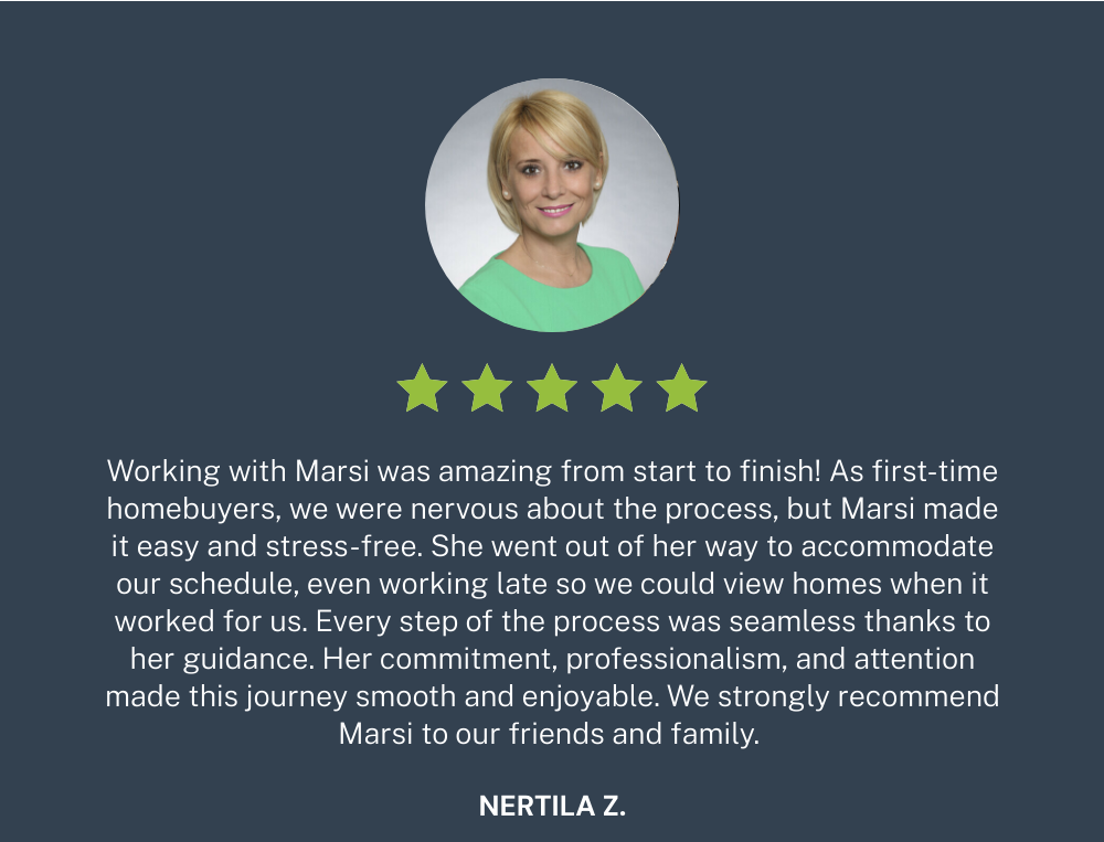 Working with Marsi was amazing from start to finish. As first-time homebuyers, we were nervous about the process, but Marsi made it easy and stress-free. She went out of her way to accommodate our schedule, even working late so we could view homes when it worked for us. Every step of the process was seamless thanks to her guidance. Her commitment, professionalism, and attention made this journey smooth and enjoyable. We strongly recommend Marsi to our friends and family.